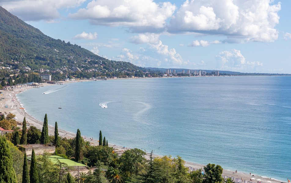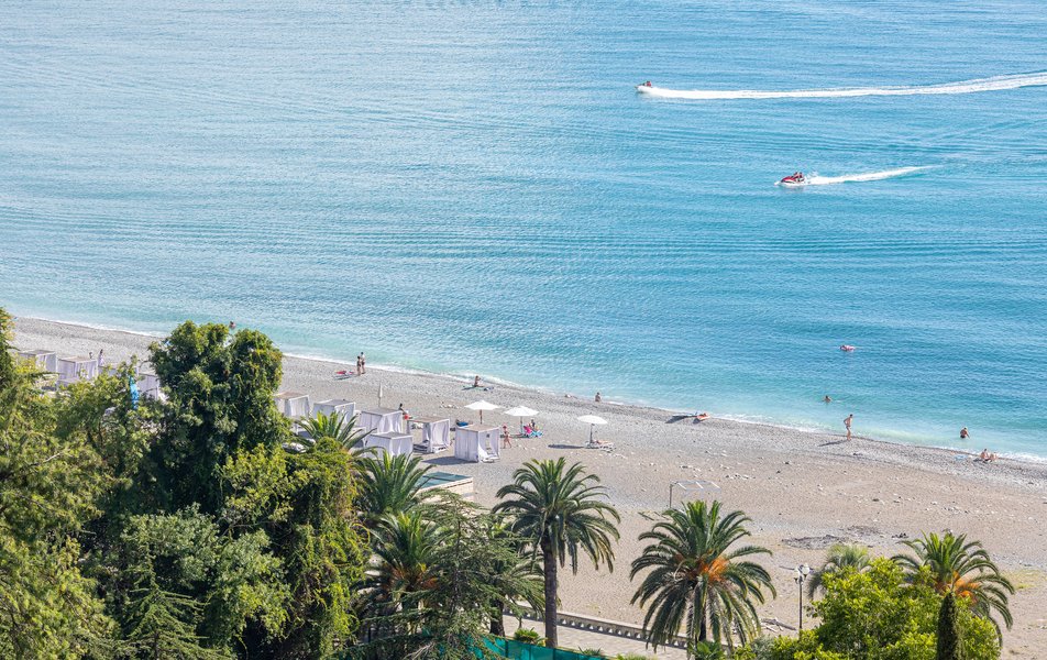Пляжная полоса в этом районе широкая и протяженная, состоящая из чистой мелкой гальки и песка, с пологим спуском к морю. Приятно отметить, что купальный сезон в Абхазии начинается в еще середине мая и продолжается до конца октября – ведь солнечных дней здесь очень много, а теплый субтропический климат помогает поддерживать температуру воды очень долго.